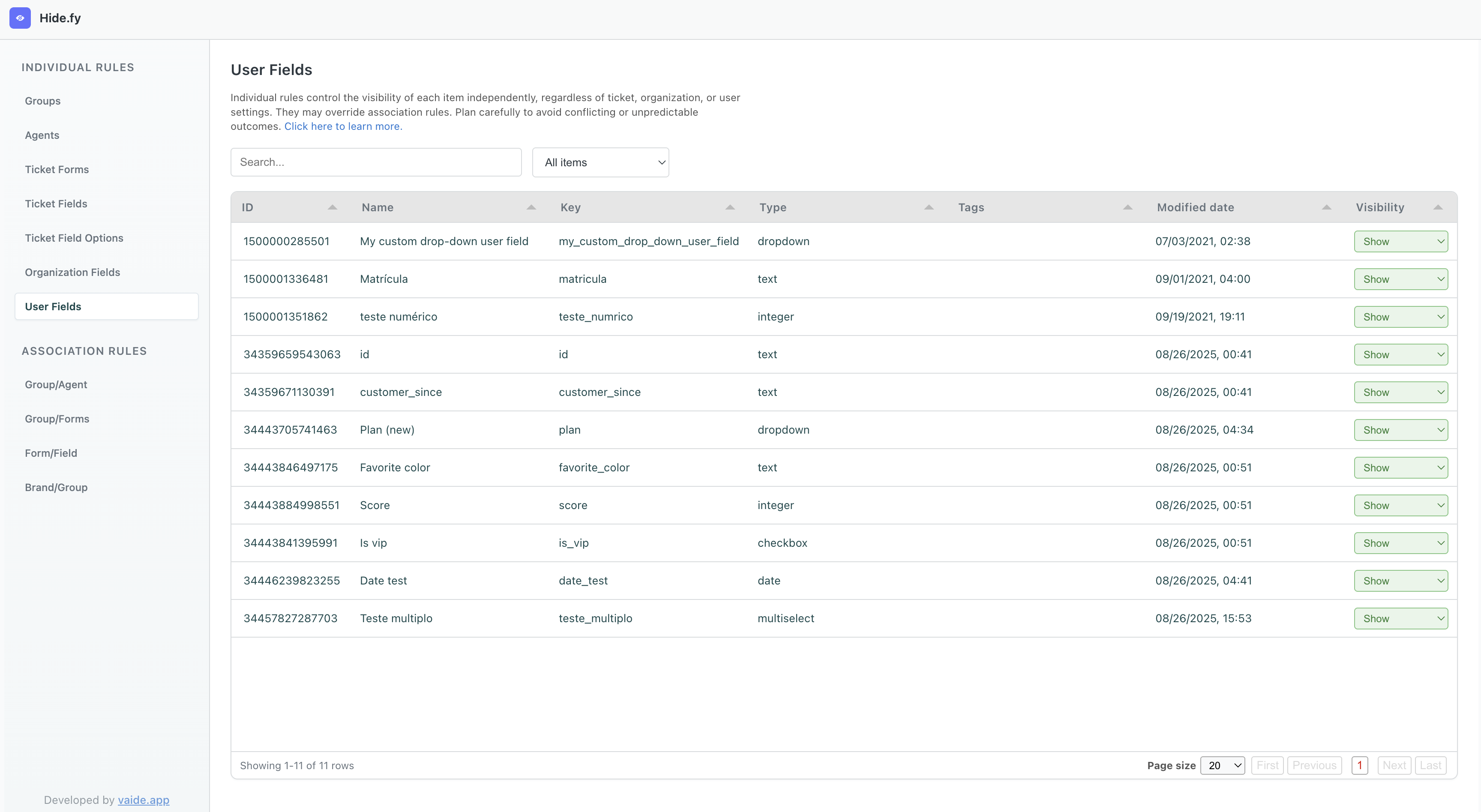 The User Fields rule of the Hide.fy app allows you to control the visibility of fields displayed in the detailed view of the user in Zendesk. Similar to organization fields, this functionality only allows you to hide or keep specific fields visible, promoting a cleaner, more objective interface aligned with operational needs.