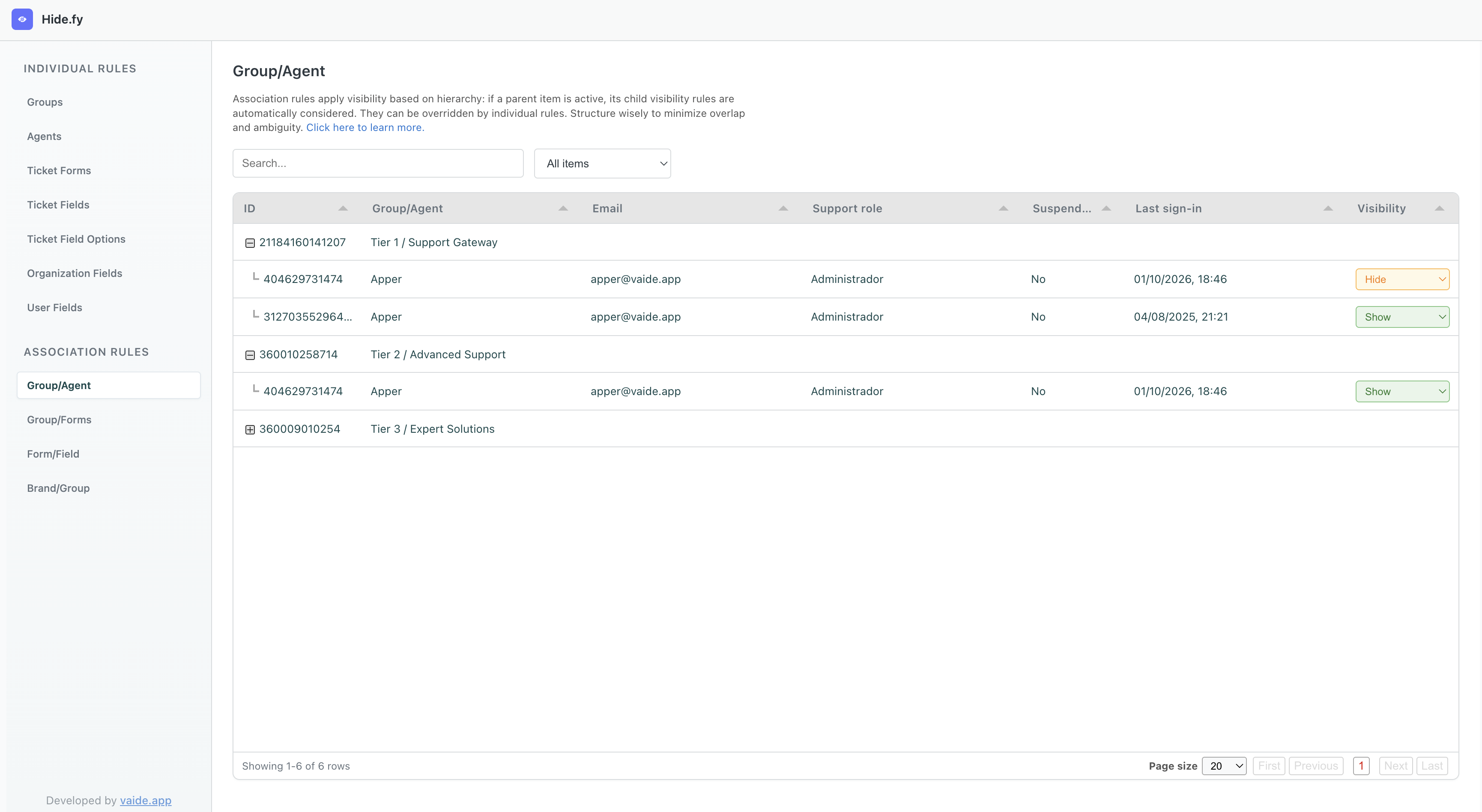 When configuring the Group/Agent Association rule, Hide.fy evaluates the selected group in the ticket and applies the corresponding rule for the agents associated with that group.