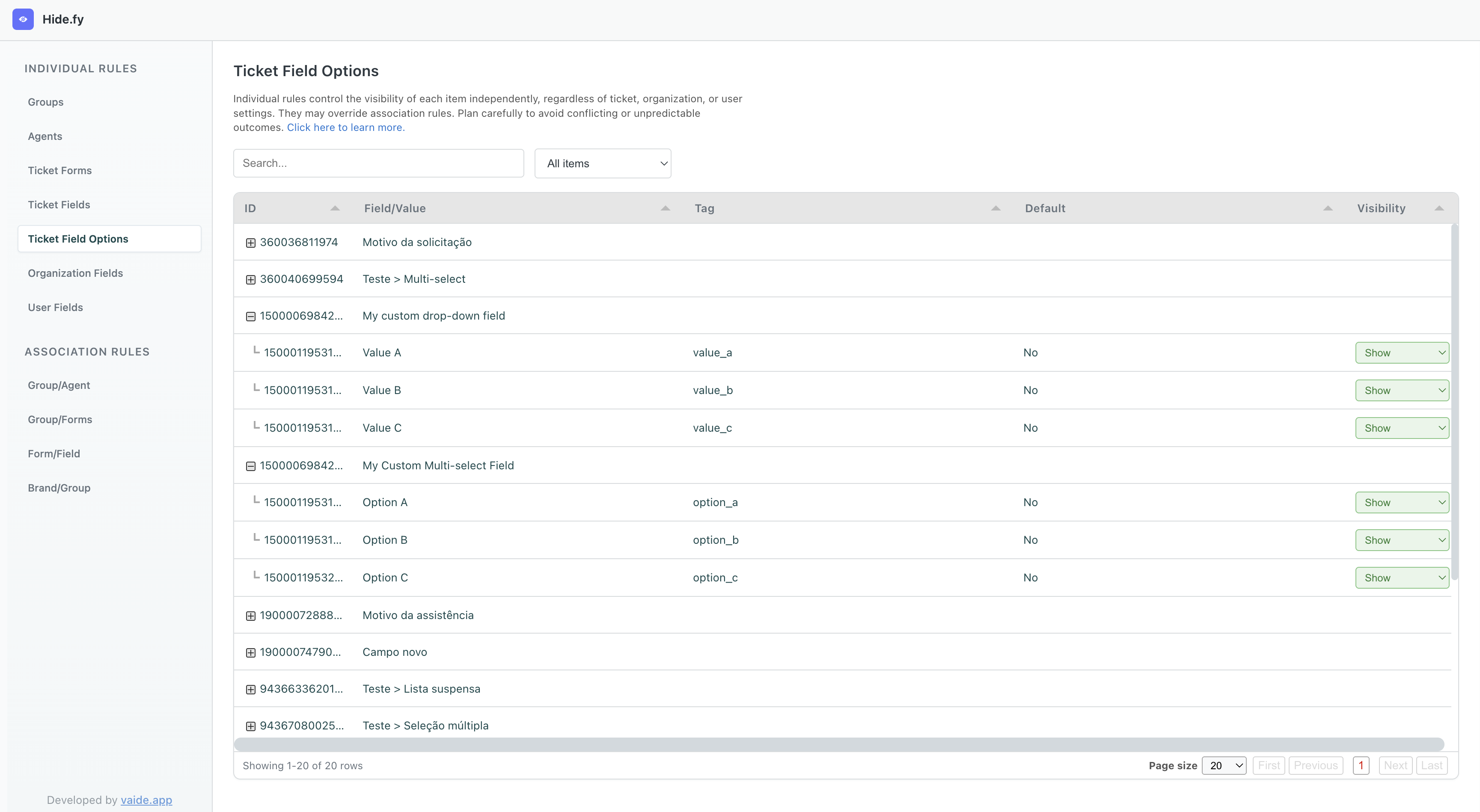 La aplicación Hide.fy ofrece control granular no solo sobre formularios y campos, sino también sobre los ítems internos de esos campos. La regla de Ítems de Campos de Ticket actúa directamente sobre los valores presentados en campos del tipo dropdown y multi-select, permitiendo una curaduría más estratégica de las opciones disponibles.