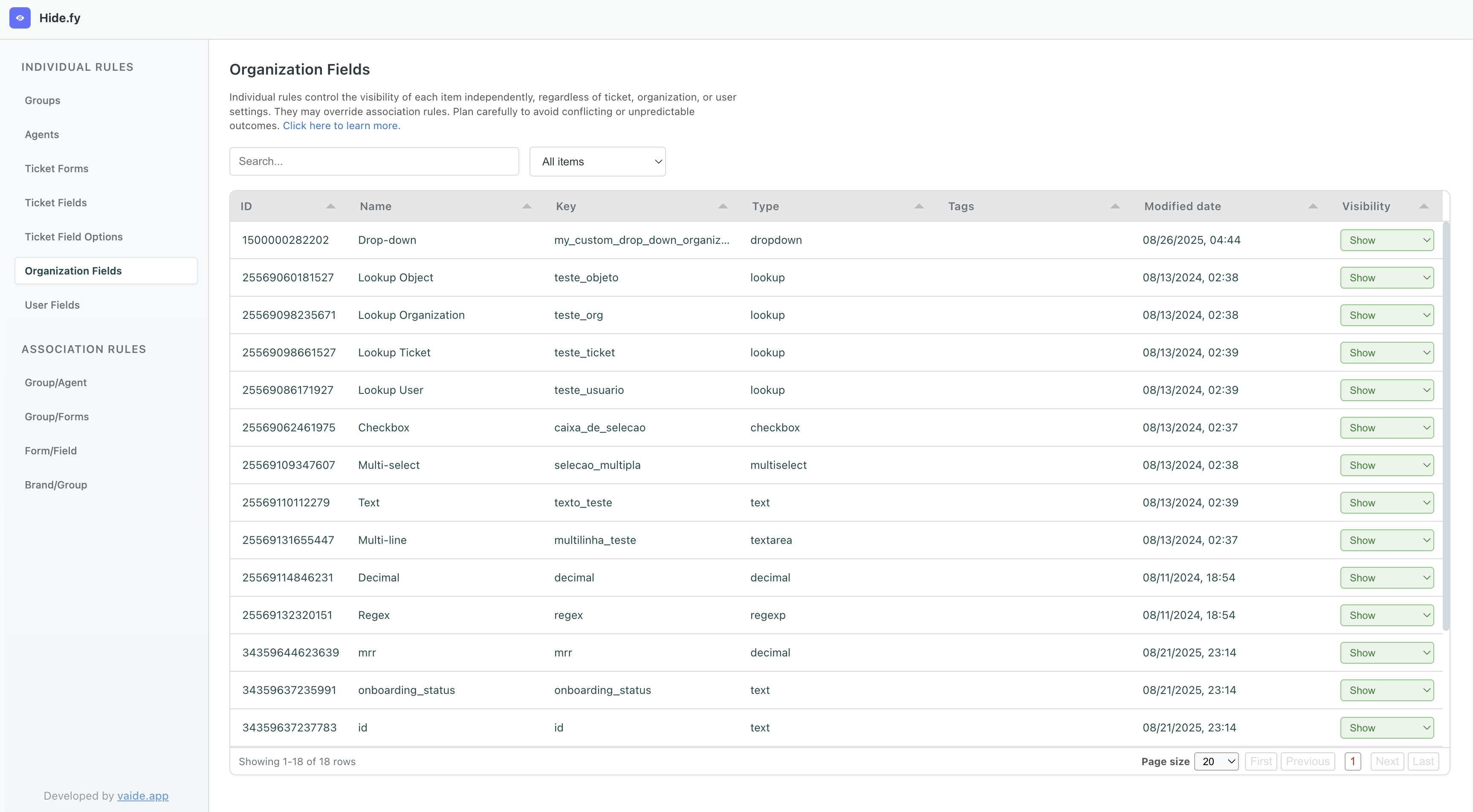 La aplicación Hide.fy extiende el control operativo más allá de los tickets, permitiendo gobernanza también sobre los datos de organizaciones. La regla de Campos de Organización actúa exclusivamente en la visualización detallada de la organización, sin impactar formularios de ticket o flujos de automatización.