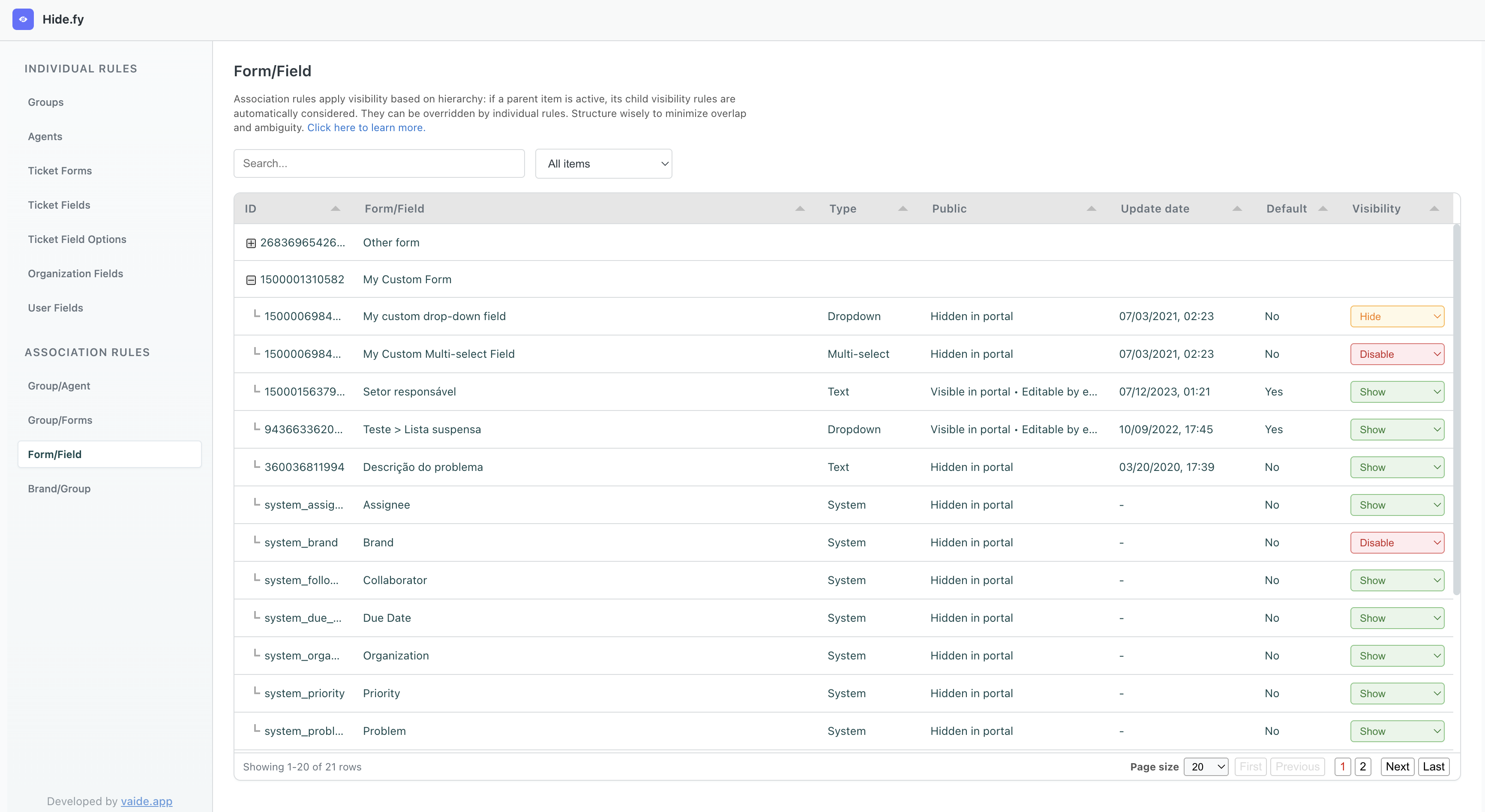 La aplicación Hide.fy ofrece reglas de asociación que actúan de forma contextual y jerárquica. La regla de Asociación Formulario/Campo permite definir cómo deben comportarse los campos de ticket dentro de un formulario específico, ofreciendo un control más refinado que las reglas individuales de campos.