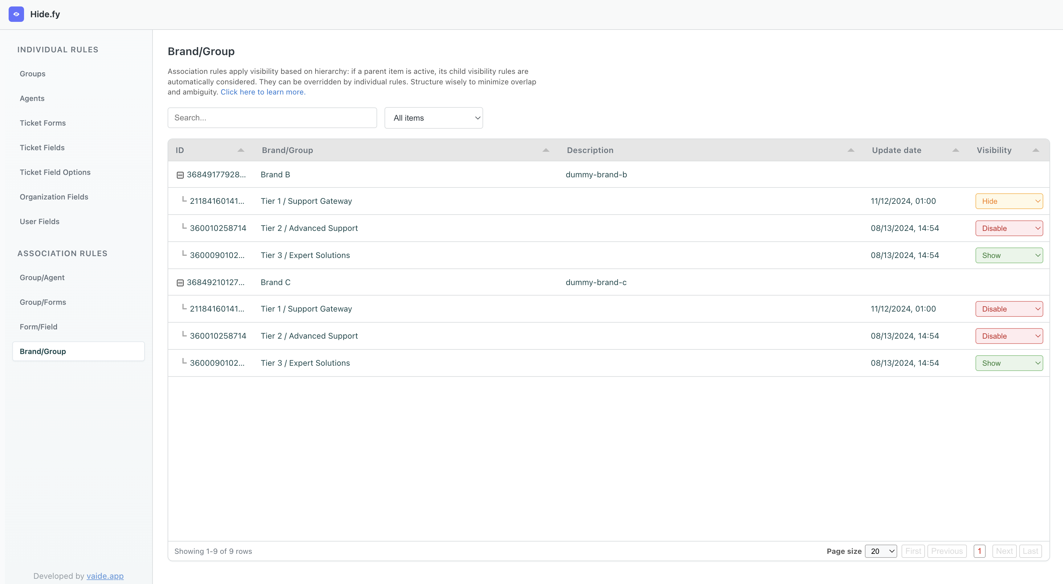 La aplicación Hide.fy ofrece reglas de asociación pensadas para operaciones Zendesk con múltiples marcas. La regla de Asociación Marca/Grupo actúa directamente en la relación entre marcas y grupos, asegurando que la lista de grupos disponibles para asignación esté alineada con la marca activa en el ticket.