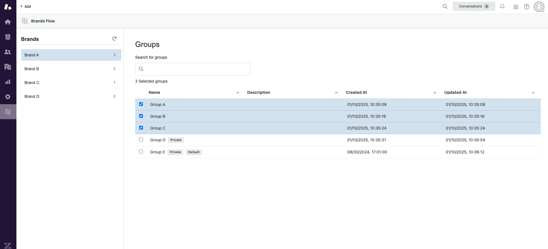 O novo dashboard, exclusivo para administradores, permite selecionar facilmente a marca que deseja editar e configurar os grupos que serão exibidos quando o agente escolher essa marca em um ticket.