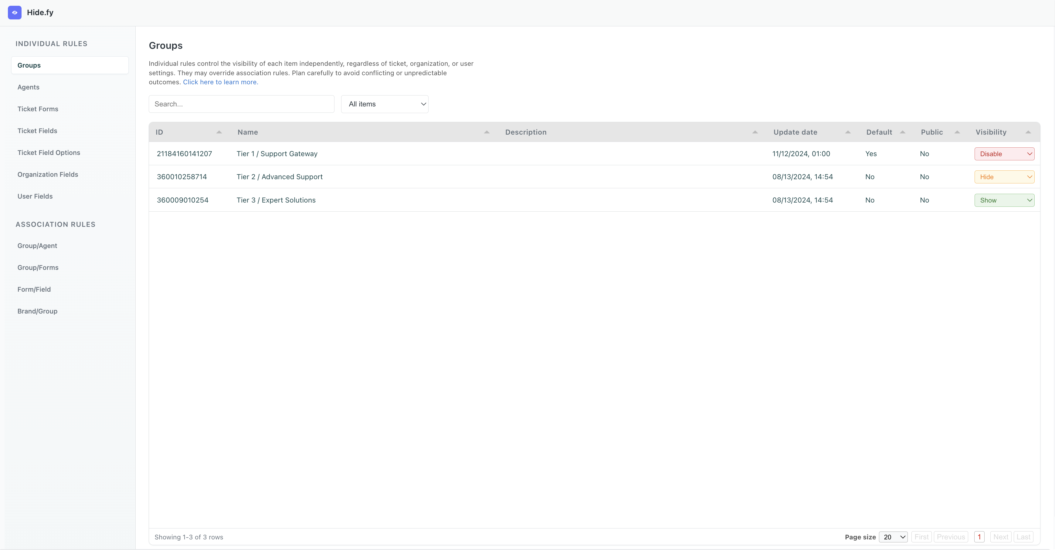 O uso da regra de Grupos no Hide.fy é indicado para ambientes Zendesk maduros, com múltiplos grupos e fluxos bem definidos, onde o controle fino da operação é um fator crítico de sucesso.