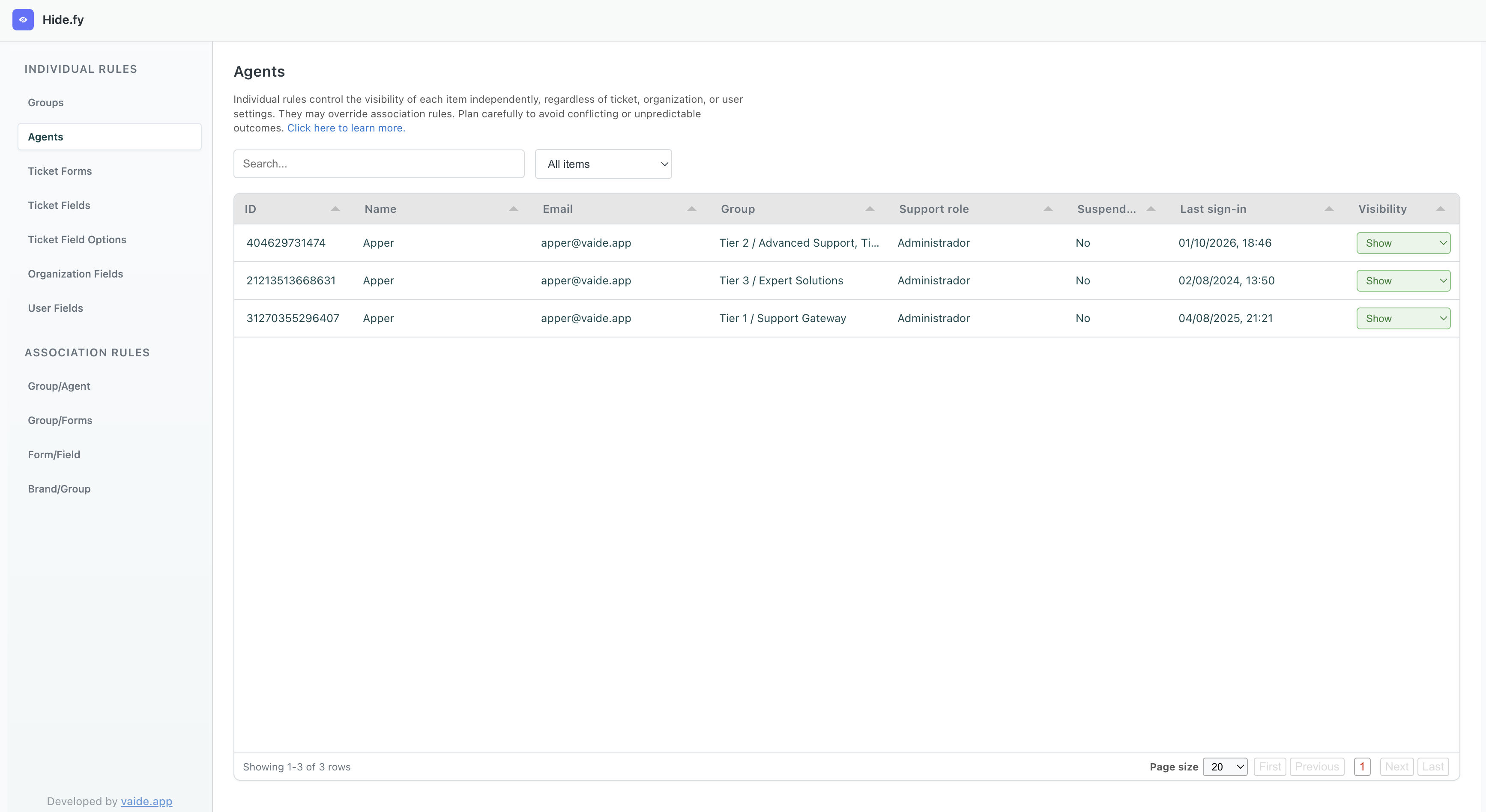 A regra de Agentes do app Hide.fy permite controlar a visibilidade, ocultação ou desativação de agentes na lista de atribuição de tickets do Zendesk. Essa funcionalidade reduz riscos operacionais, evita atribuições indevidas e reforça a governança sobre papéis estratégicos, respeitando integralmente as permissões nativas da plataforma.