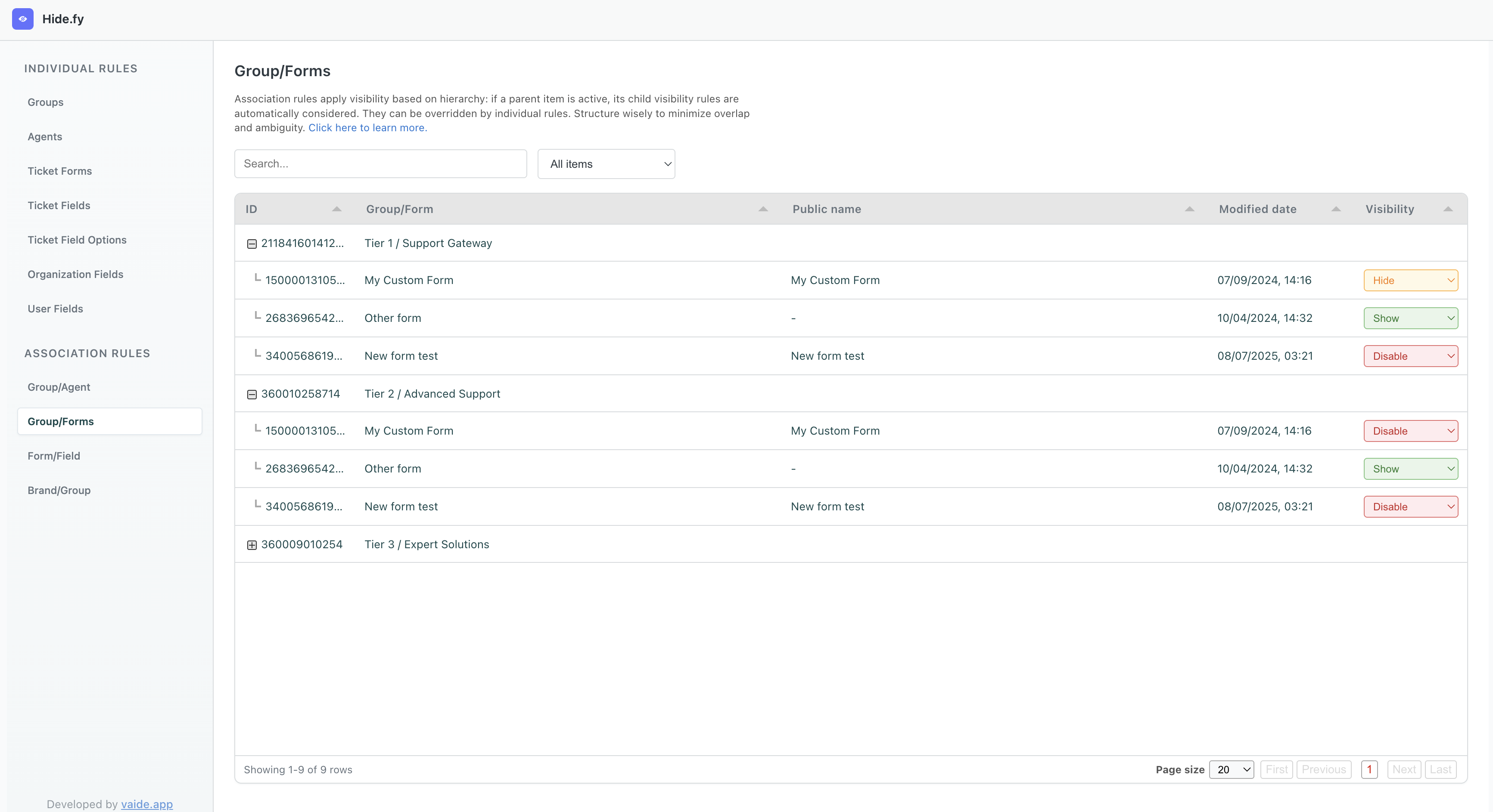 O app Hide.fy disponibiliza regras de associação que atuam de forma contextual, considerando hierarquias e relacionamentos entre elementos do Zendesk. A regra de Associação Grupo/Formulário permite definir quais formulários estarão disponíveis de acordo com o grupo responsável pelo ticket.